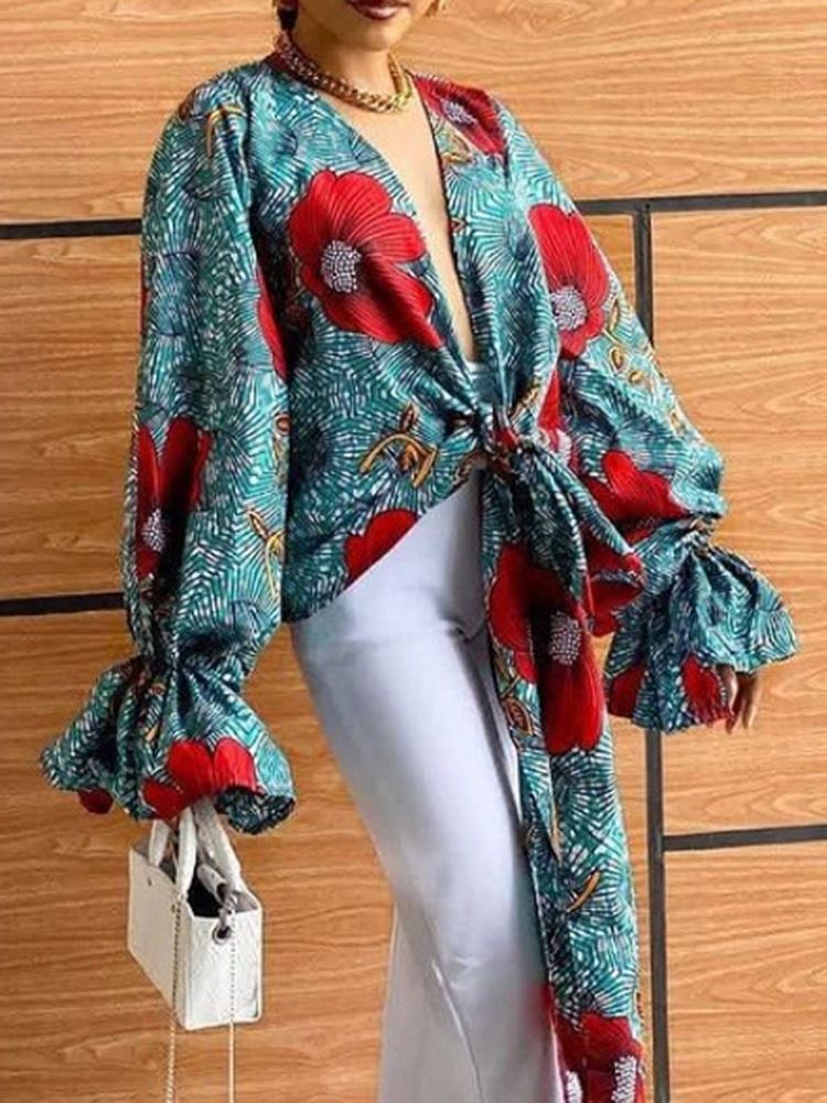 Blusa Estampada Floral Com Decote Em V Manga Longa Blusa Feminina Padrão