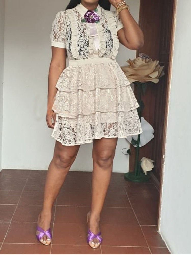 Feminino Lace A-line Curta Manga Curta Gola Curva Vestido Regular Franzido