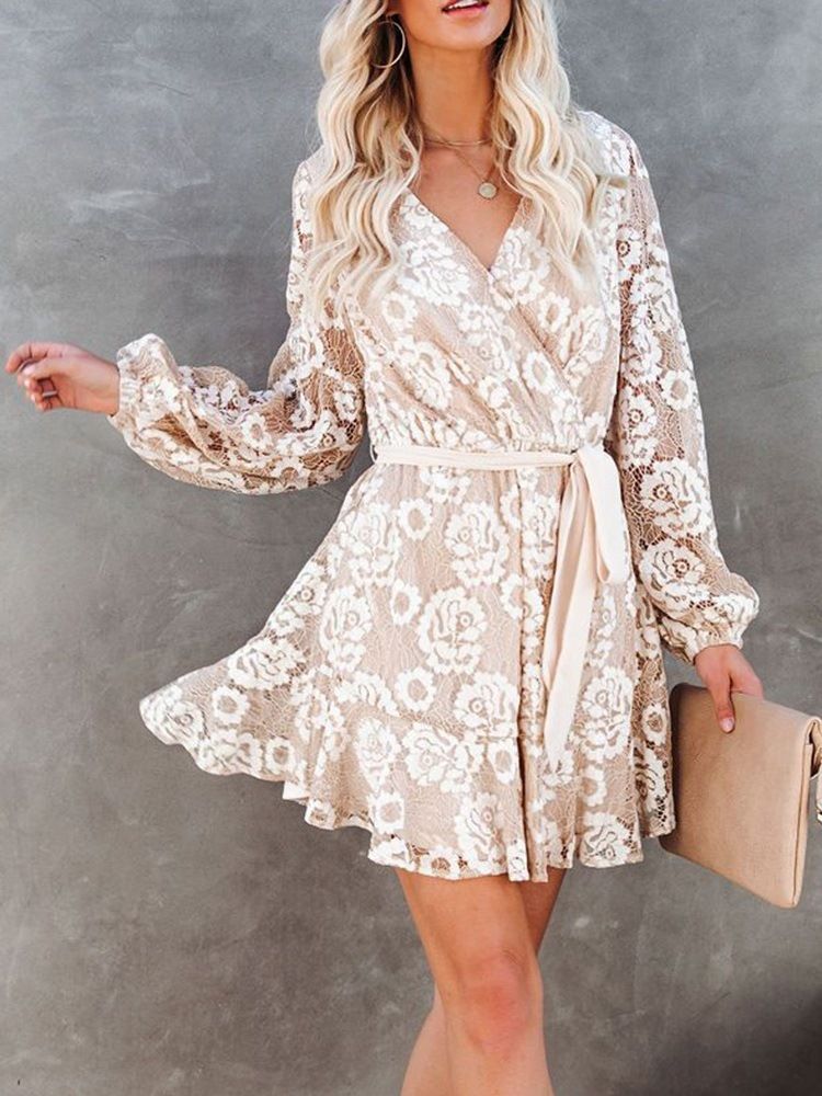 Manga Comprida Bordado Com Decote Em V Cintura Média Vestido Doce Feminino