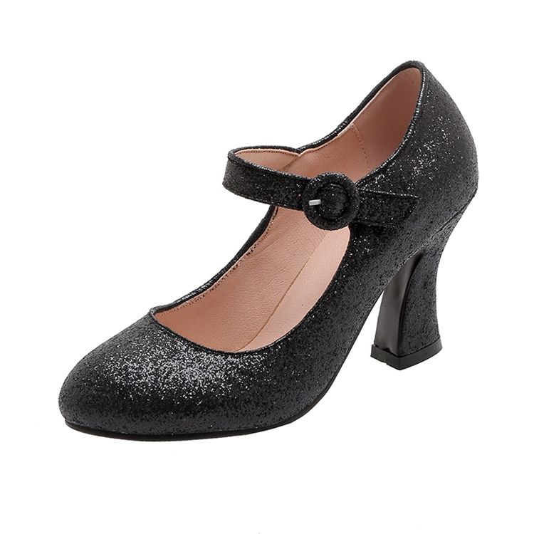 Sapatos Femininos Com Fivela De Lantejoula Redondo De Dedo Do Pé Redondo 8 cm