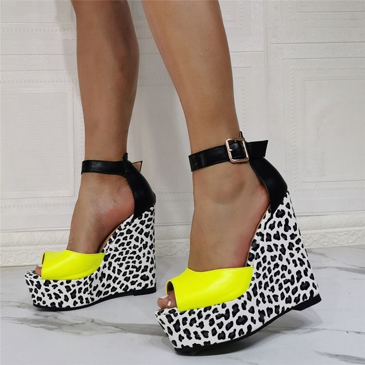 Sapatos Finos Femininos Com Salto Em Cunha Peep Toe Fivela Leopardo