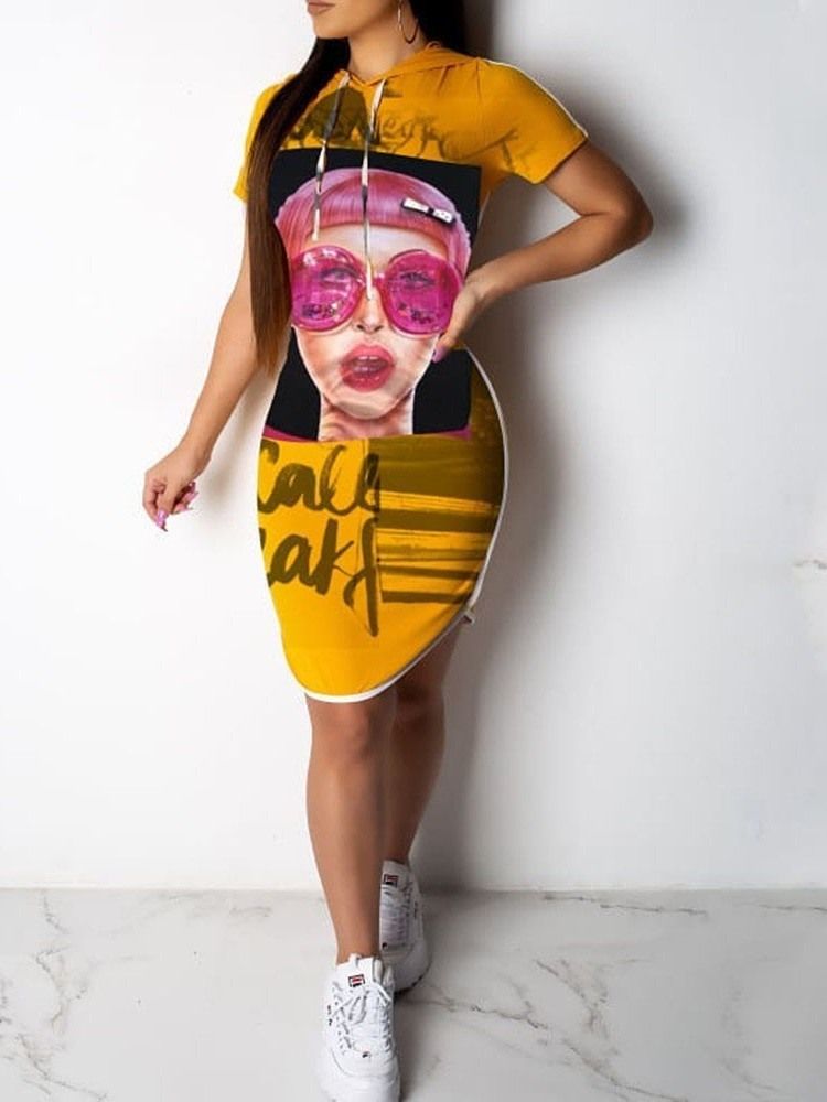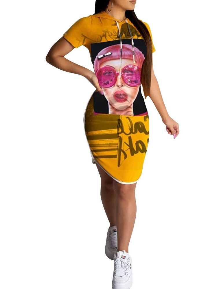 Vestido Feminino De Manga Curta Assimétrica Com Capuz Casual Cartoon