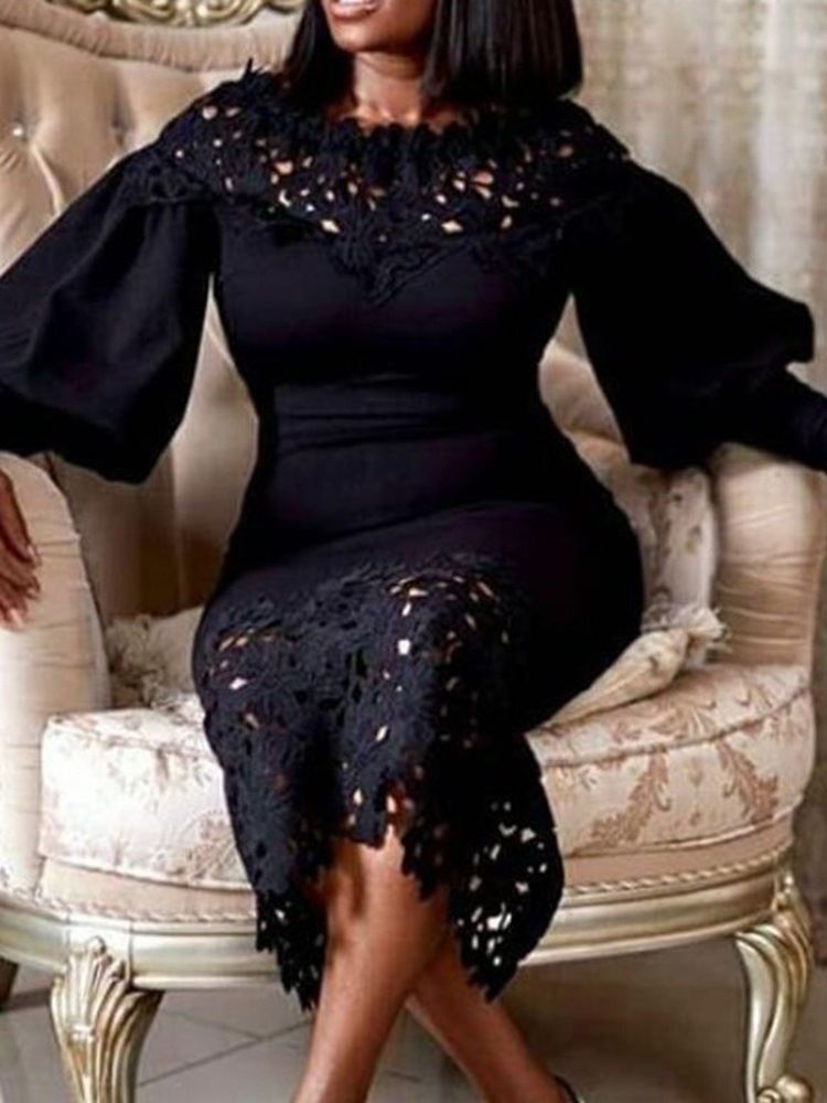 Vestido Feminino Oco De Manga Longa Meia Panturrilha Bodycon Maxi Lace